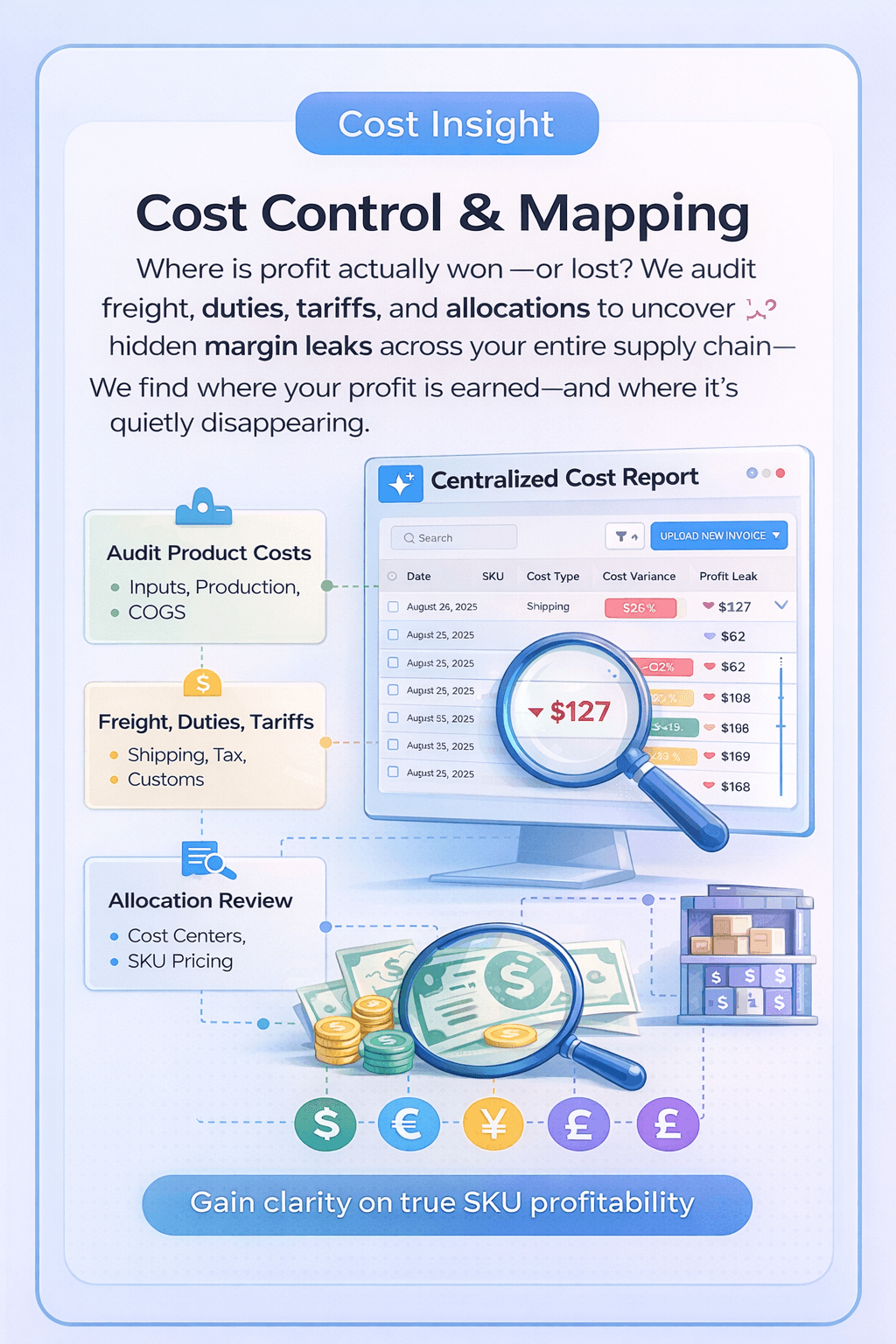 We perform a deep audit of your product costs, freight, duties, tariffs, and allocations to uncover hidden margin leaks, cost variances, and profitability blind spots across your supply chain.